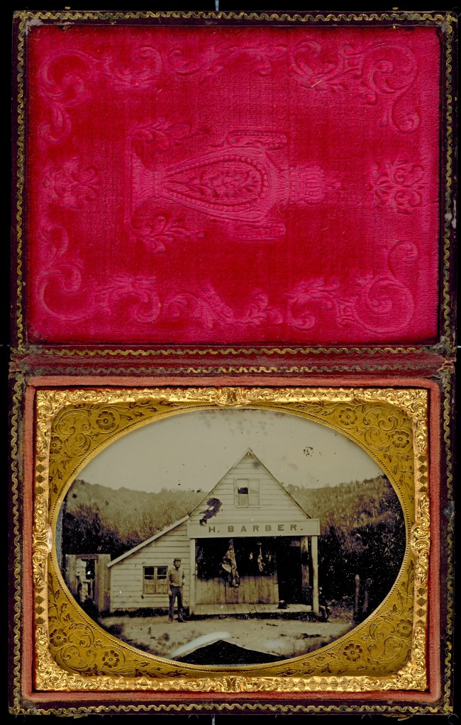 Last time I consulted the archives I searched a database, requested the archivist, made an appointment to visit the archive, travelled to a building in Newtown (from memory), was ushered into a room and shown the object of my interest, an “Ambrotype or Collodian glass negative (underexposed) in a protective case” of H Barber butcher Lambton Quay, in front of his shop. A search today and there it is, an image of the shop and an image of the object that houses the image. Admittedly not the same thrill as seeing the real thing – exquisite – but brilliant for research. And there is no known copyright, so it can be reproduced.